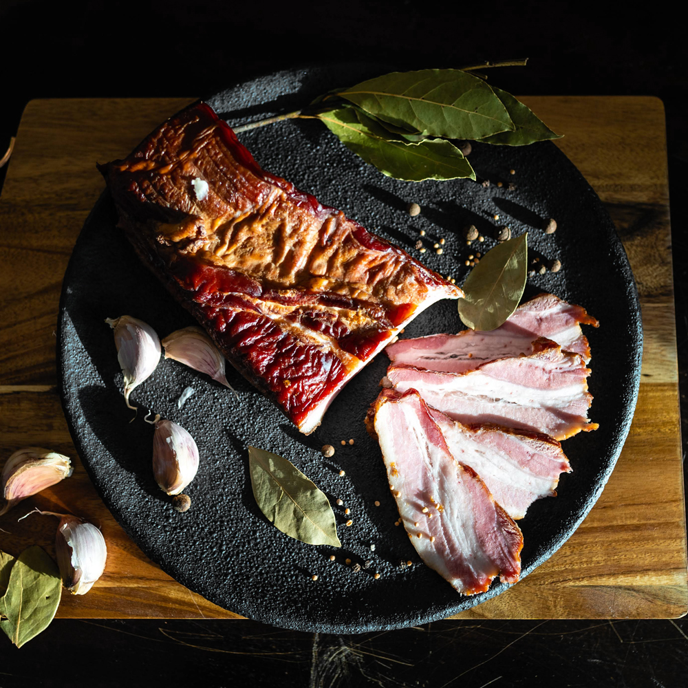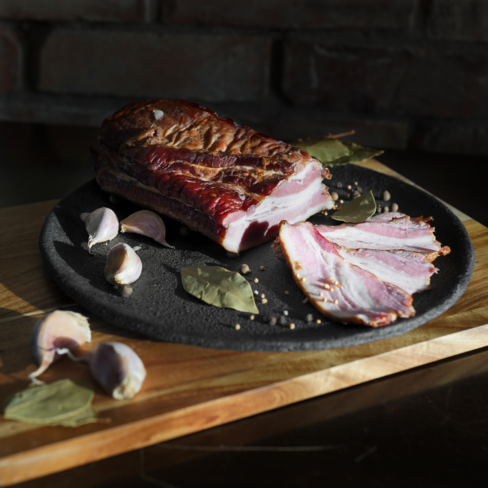 Co sprawia, że sprzedawany przez nas boczek wędzony surowy wyróżnia się doskonałym smakiem oraz niepowtarzalnym aromatem? Stosujemy tradycyjną metodę wędzenia na drewnie olchowym i/lub bukowym. Ponadto do wyrobów nie dodajemy ulepszaczy smakowych, korzystamy także z naturalnych oraz odpowiednio dobranych przypraw.