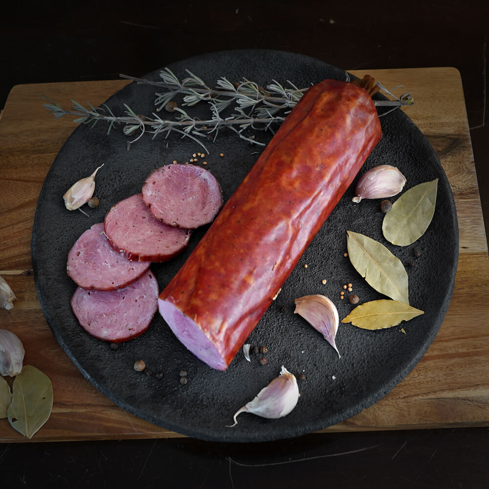 Kiełbasa idealna na kanapki. W jej przekroju zobaczymy wyraźnie widoczne większe kawałki szynki. Waga całego produktu to ok. 500 g.