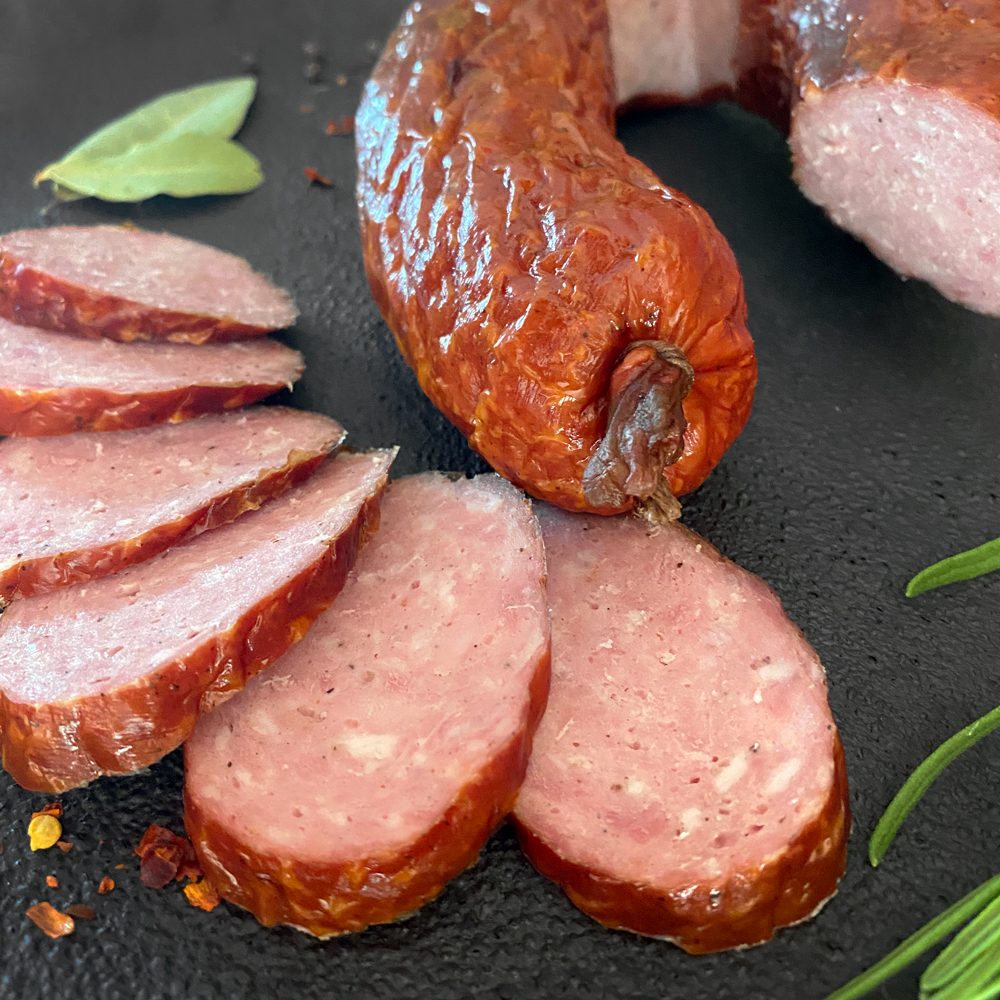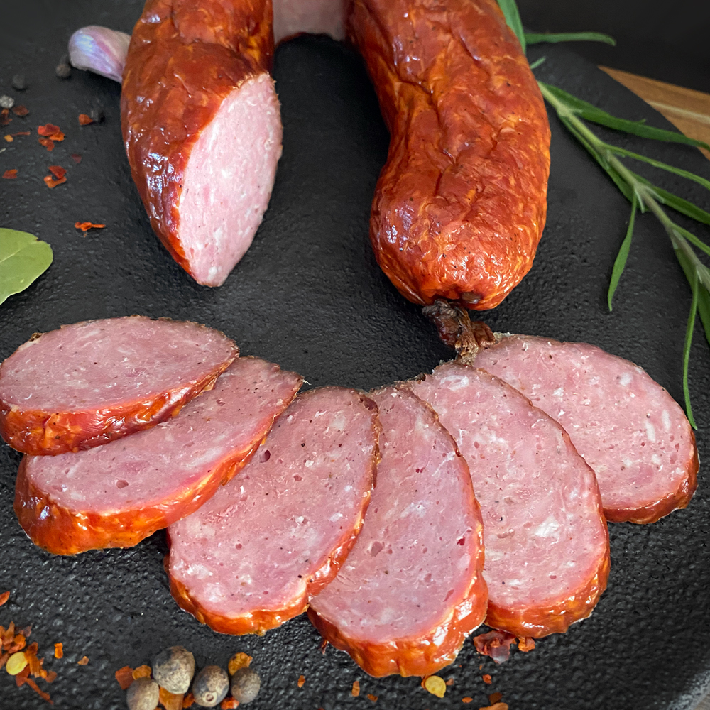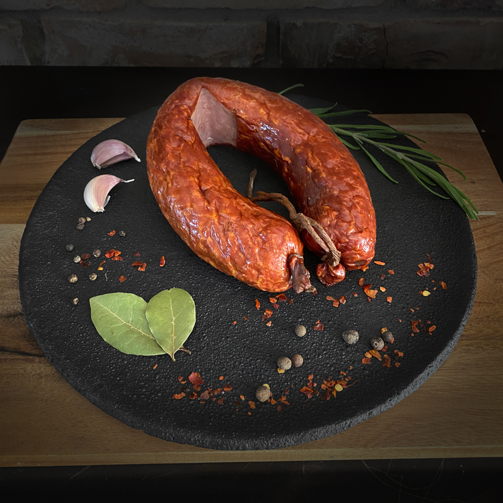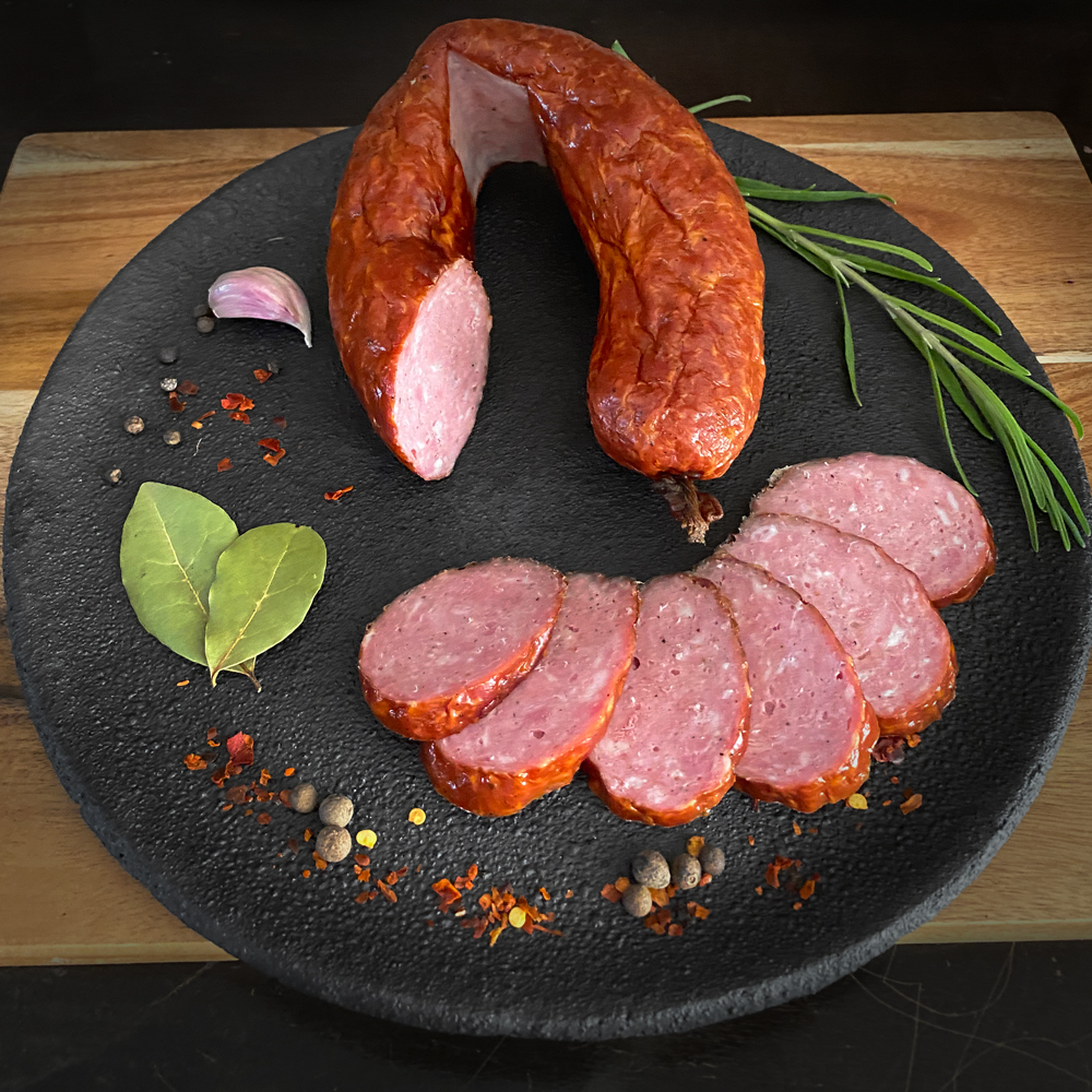 Kiełbasa, której smaku i zapachu nie zapomnisz na pewno, który zawdzięcza owocom jałowca. Krucha i bardzo aromatyczna wędlina polecana na kanapki. Waga pętka kiełbasy to ok. 500 g.