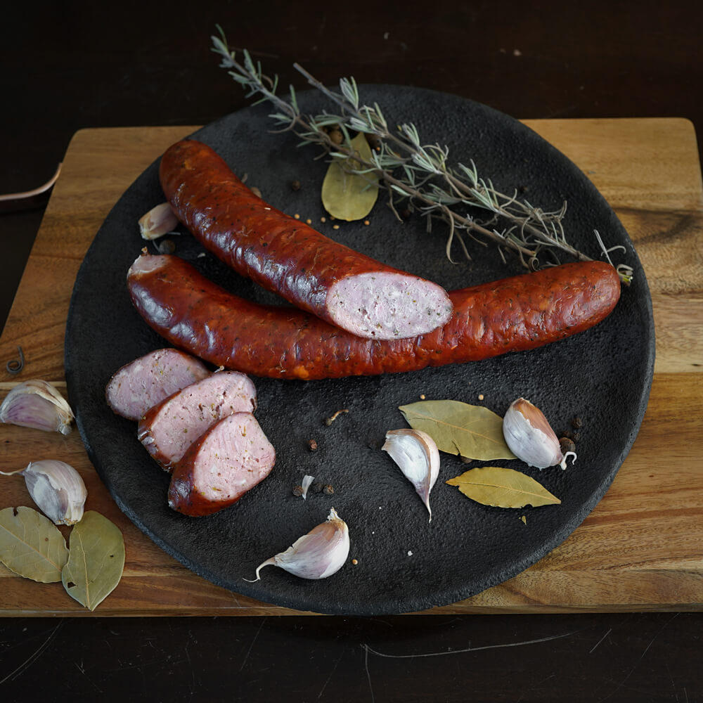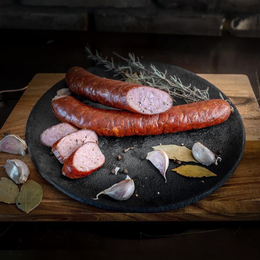 Niebywale krucha kiełbasa, mocniej przyprawiona o wyrazistym smaku. Waga pętka kiełbasy to ok. 150 g.