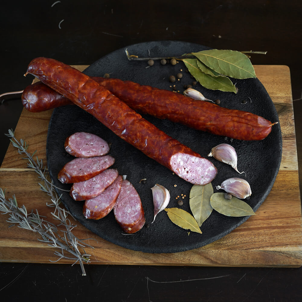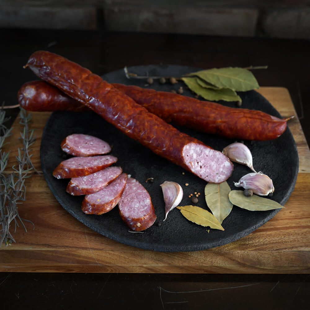 Zapraszamy do skosztowania naszej domowej kiełbasy swojskiej. Chcielibyśmy podzielić się z Wami smakiem i tradycją, jaką niesie za sobą ten produkt. Nasza wędzona kiełbasa domowa to prawdziwa uczta dla smakoszy. Charakterystyczna, intensywna woń dymu bukowego, delikatna konsystencja, soczystość i wyjątkowy smak oparty na długim wędzeniu i odpowiedniej mieszance przypraw sprawią, że nie będziesz mógł się jej oprzeć.